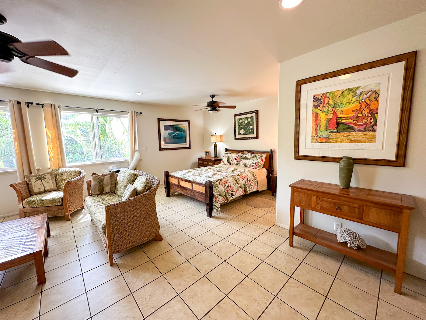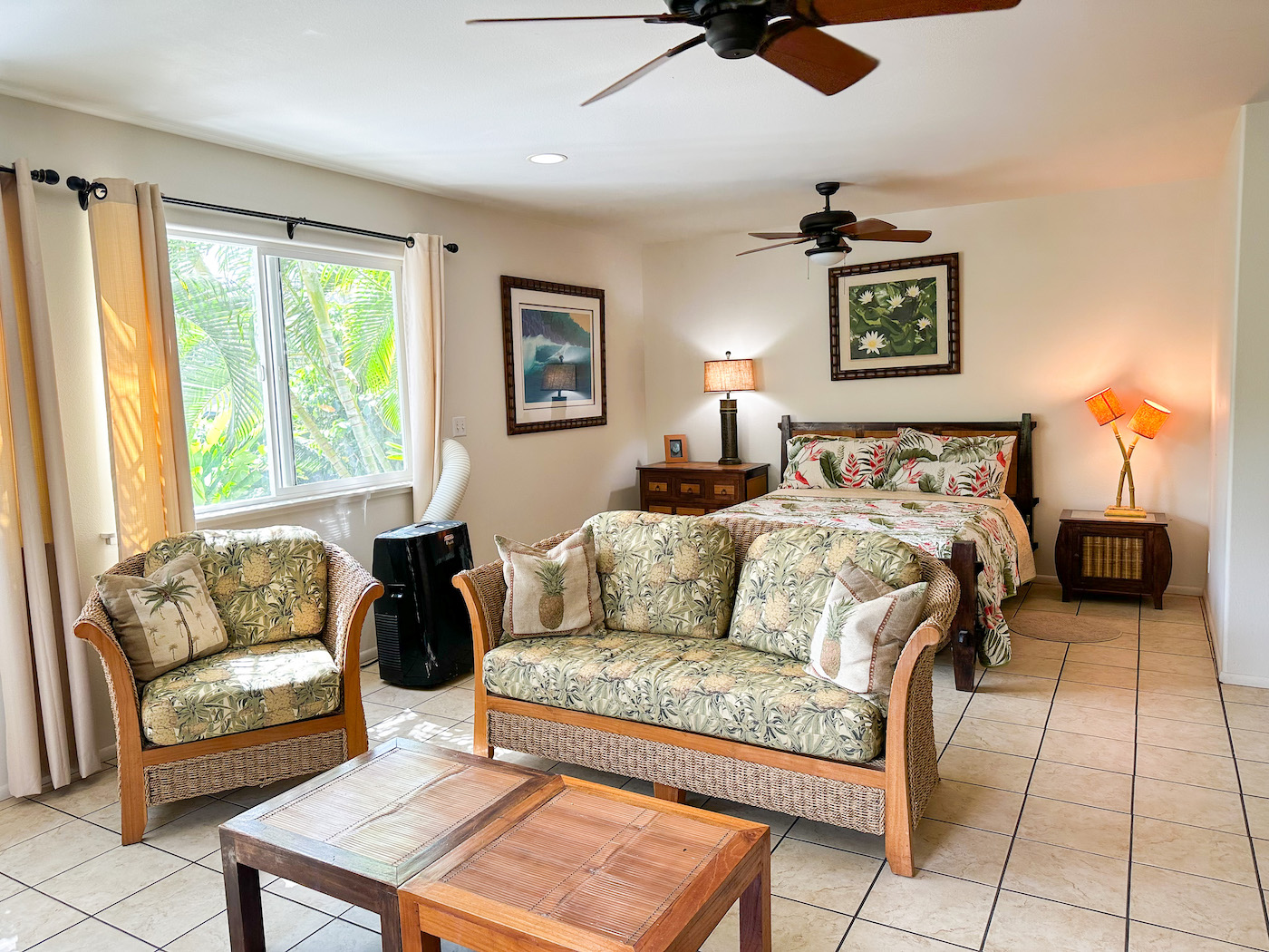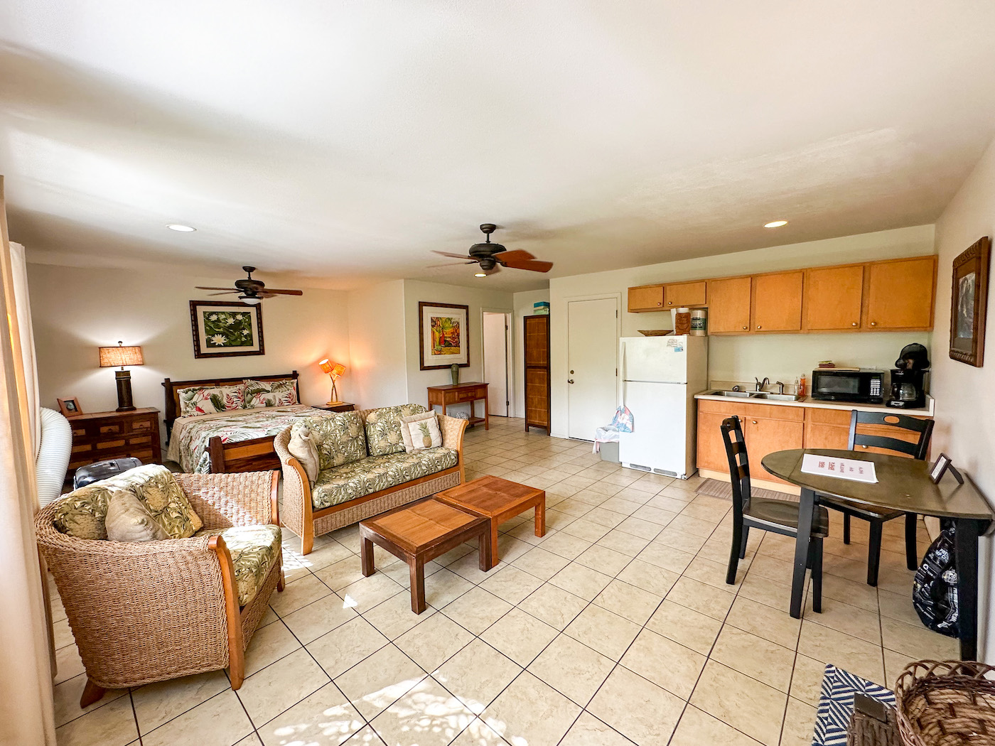 A private beach getaway. Our studio has one queen bed and a kitchenette.