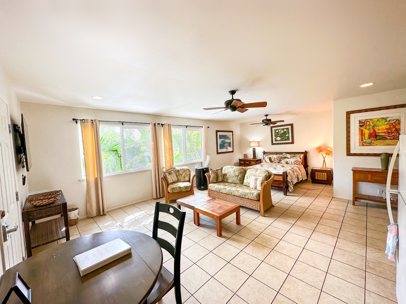 Rest and recharge in our studio suite. Great for 2 people, our suite has one queen bed, seating area, tv, kitchenette, and dining table. Studio Suite is air conditioned as well with great WIFI connection.